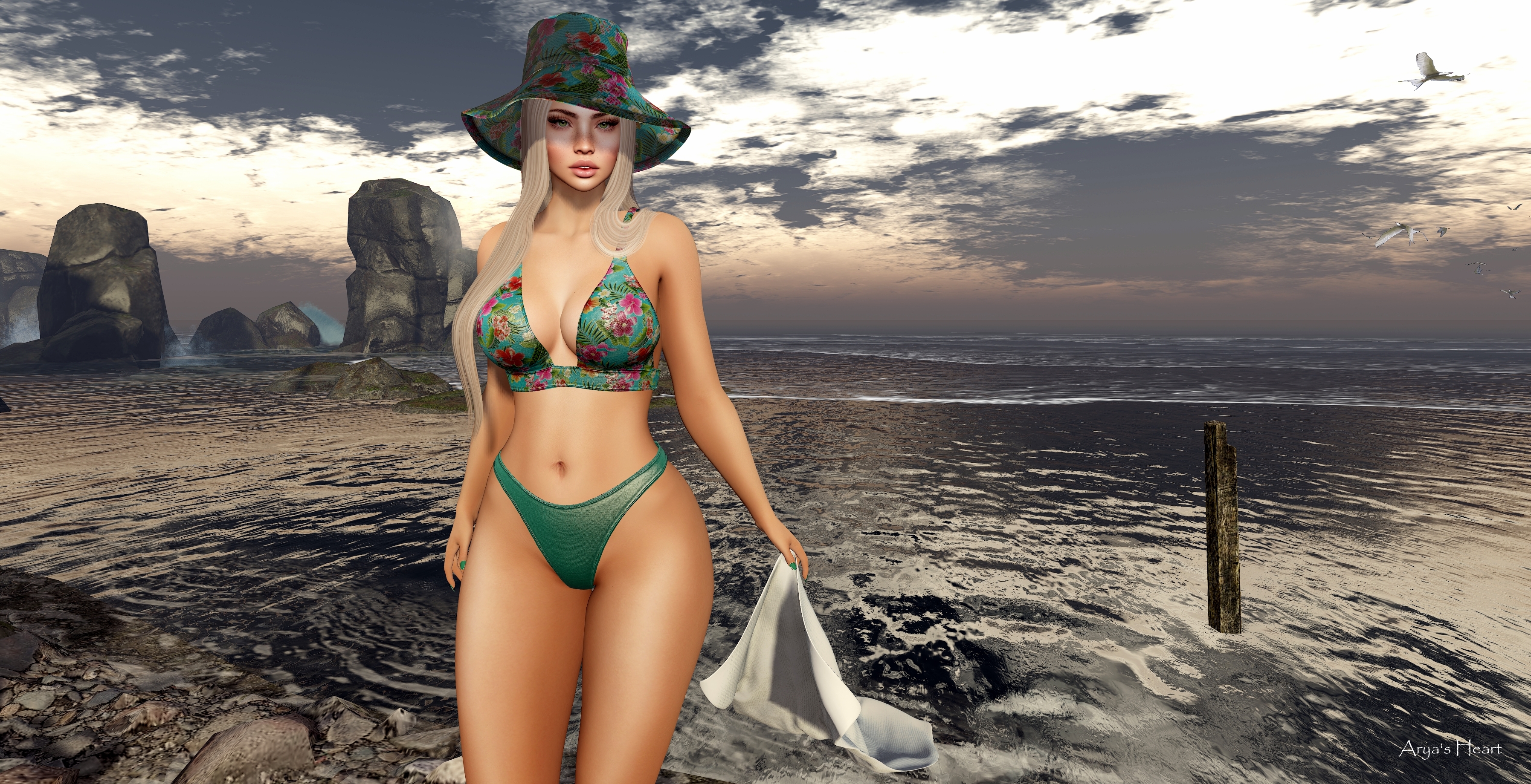 Anyway, I am feeling much better and am looking fabulous in this Maai Set from VESTA at SWANK. The set includes the hat, bikini top and bikini bottom. The top comes in three different textures: Hibiscus (shown), Floral, and Neon Leaves. There is also a hud for the bikini bottoms so you can match them to the colours in the top. The set is available for Lara X (shown), ebody, Legacy, and Legacy Perky.